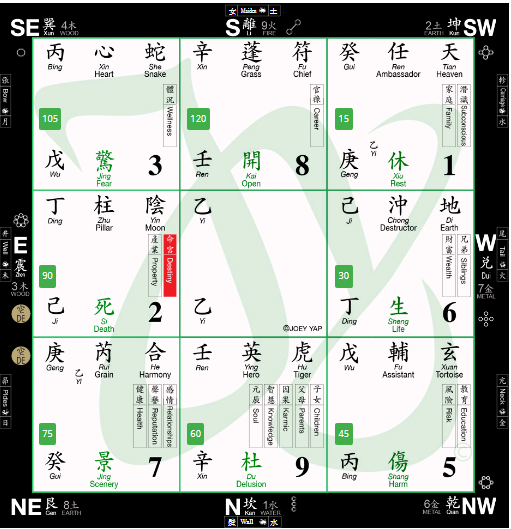 As indicated by the chart, her Destiny Palace is in the East, the Zhen Palace. As the Zhen Gua is Wood element, what counters Wood would be the Dui and Qian Palaces which lies in the West and Northwest respectively; both of which are Metal Element. These two palaces represent her Wealth Palace as defined by the Life Door, her Risk Palace as defined by the Harm Door and the Education Palace as defined by the Heavenly Assistant star.