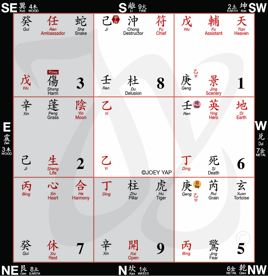 To form the Nobility Deception structure the palace in question needs to contain the Six Harmony deity, any one of the Three Nobles stems (Yi Bing or Ding) for the Heavenly Stem; as well as the Rest, Life or Open Door.
